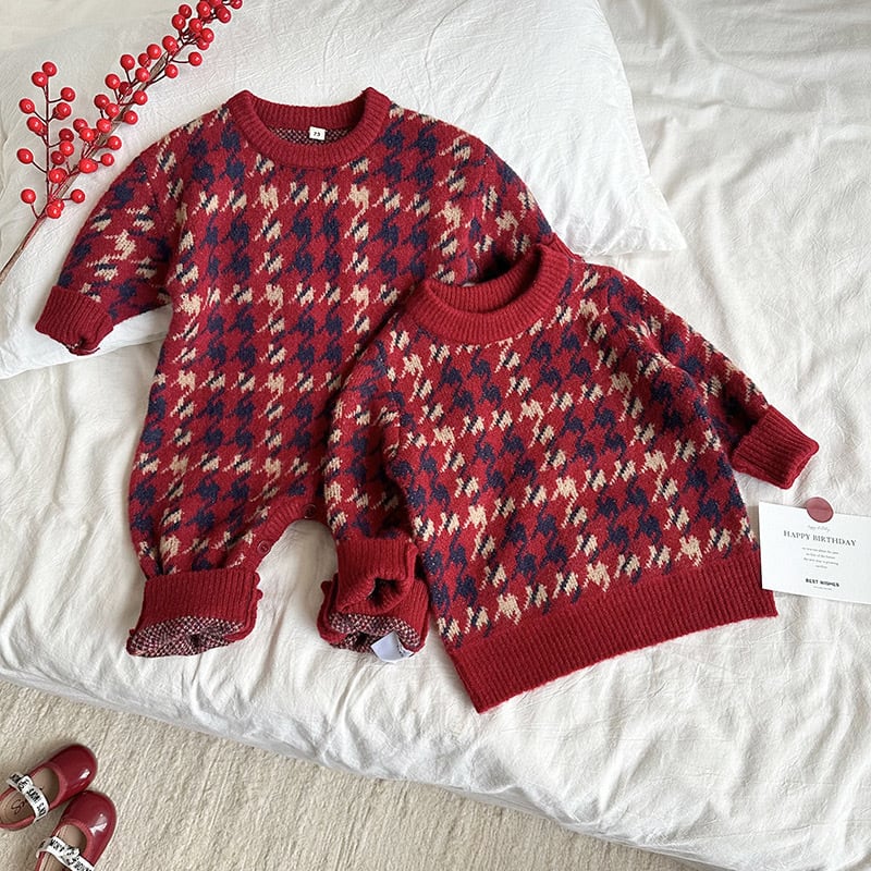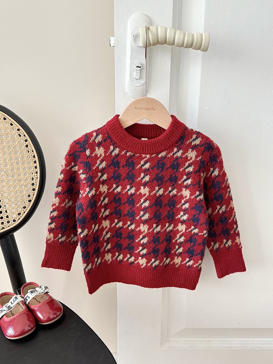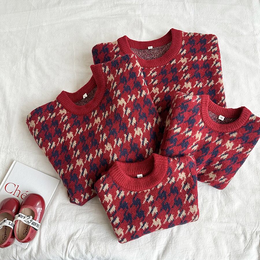 秋冬の装いにぴったりなチドリ柄をあしらったニットです。暖かく柔らかな風合いで、家族でのお出かけや特別な日の写真撮影に最適なアイテムです。