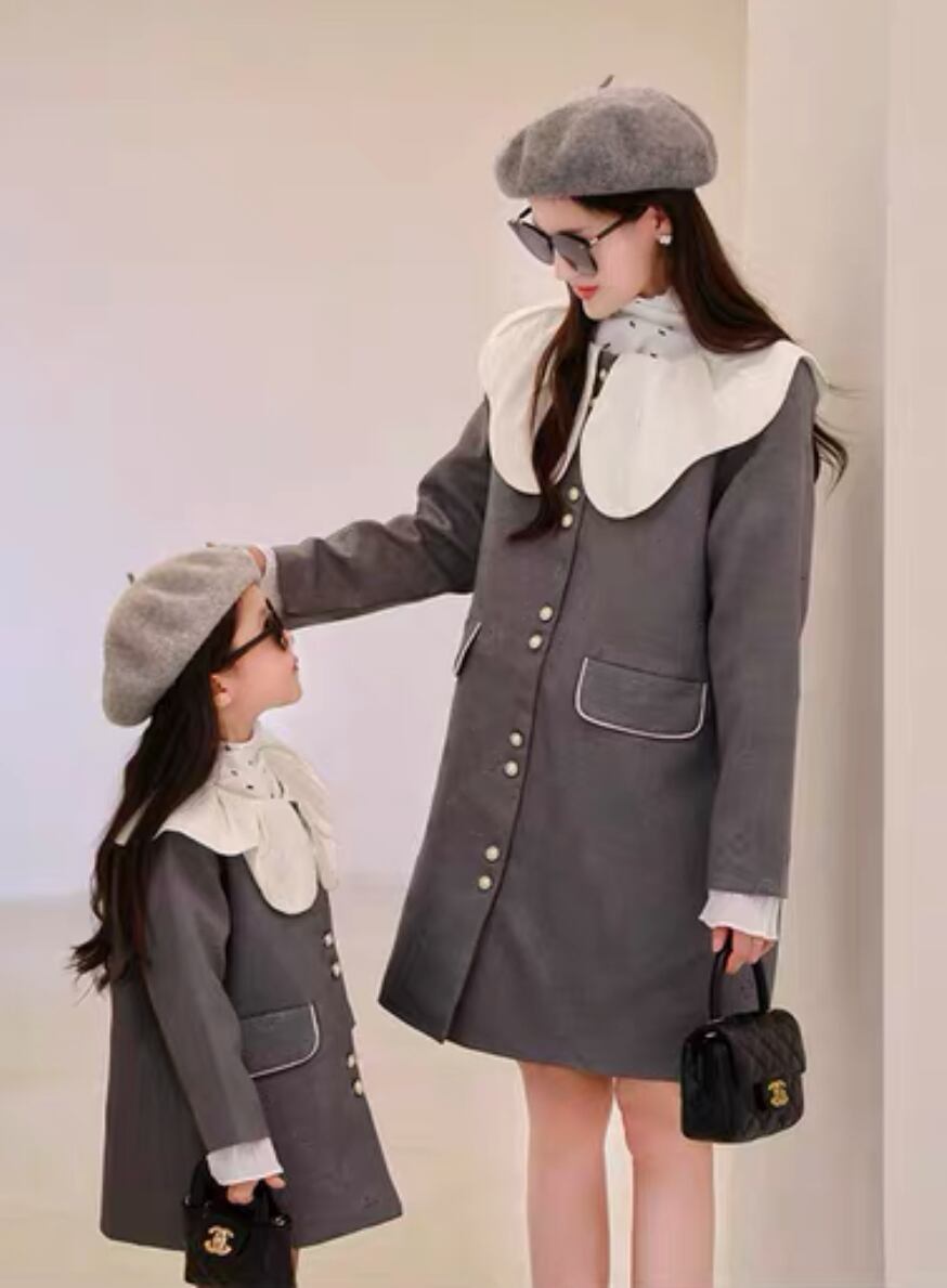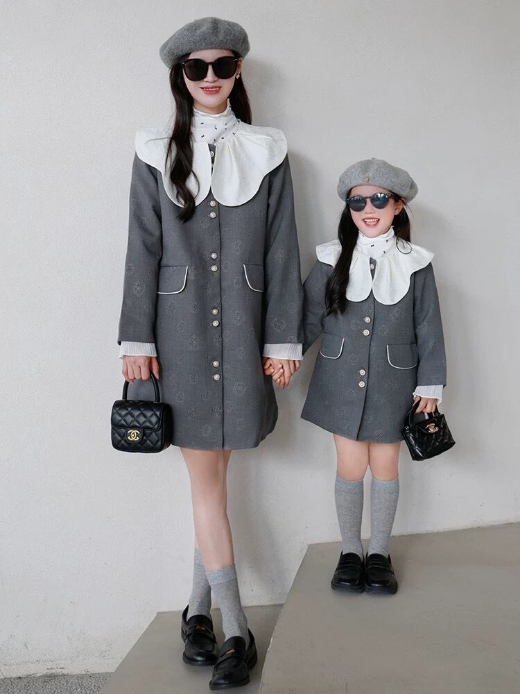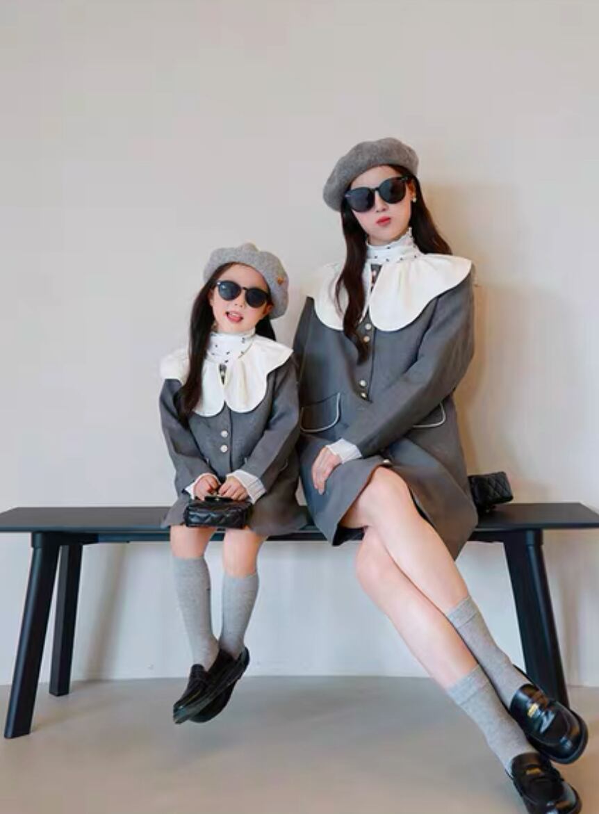 シックで洗練されたリンクグレーワンピースが新登場!上品なデザインが魅力で、入園式や卒業式などの大切なイベントに最適です。ママとのリンクコーデも楽しめます♡